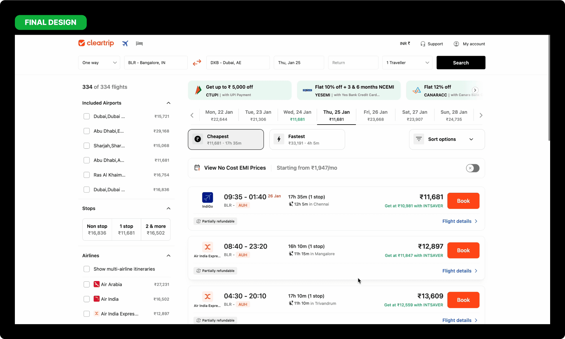 Subsequently, I collaborated with the design team to delve into the details of 3-4 selected tuples. The goal was to choose a design that not only resolved the current challenges but also demonstrated scalability for application in domestic booking scenarios. This collaborative session aimed to ensure that the selected tuple design aligned with both immediate needs and future requirements.