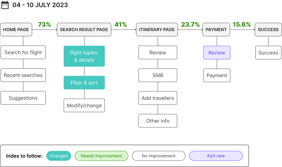 Here, we prioritized "Needs changes" based on research and current statistics, indicating it's where the maximum drop in the funnel occurs. Our initial focus in the first phase is to address and work on this aspect.